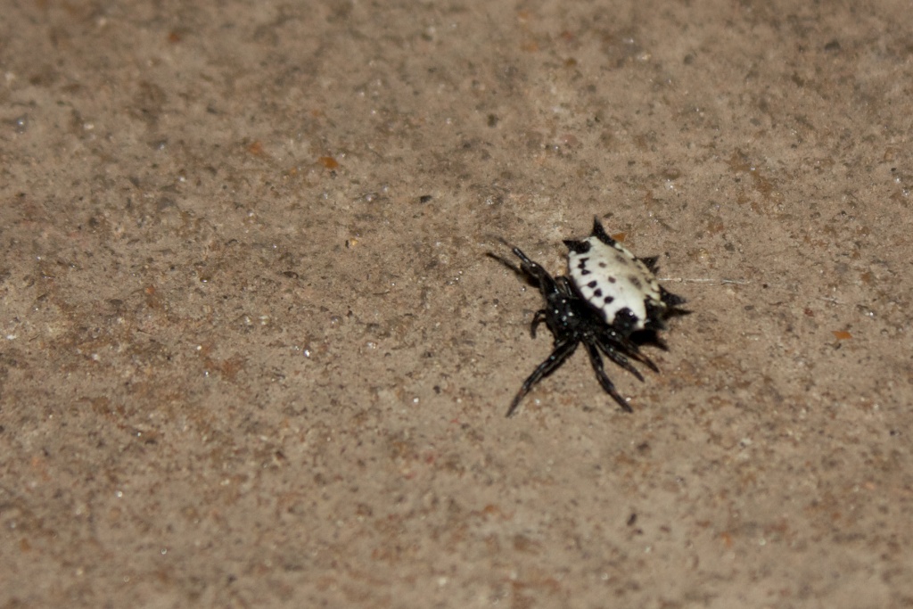 We didn't realize it was still attached to its web and when it decided to pull itself back into the bike, I kind of freaked out. Don't worry, though. I got it back down onto the floor. "Should I kill it?" my husband asked. I don't know... It seemed like it might be hard to kill. He tested squishing it with the square and sure enough that shell was hard. I ended up just balancing it on the square and carrying it out a ways from the house and dumping it. I don't know. I've never seen anything like it and I didn't really want to kill it. That shell was probably full of babies or something and I'll regret letting it go, but it even had spikes coming off of it! Have you ever seen anything like this? It's probably poisonous and we northerners just had no idea.